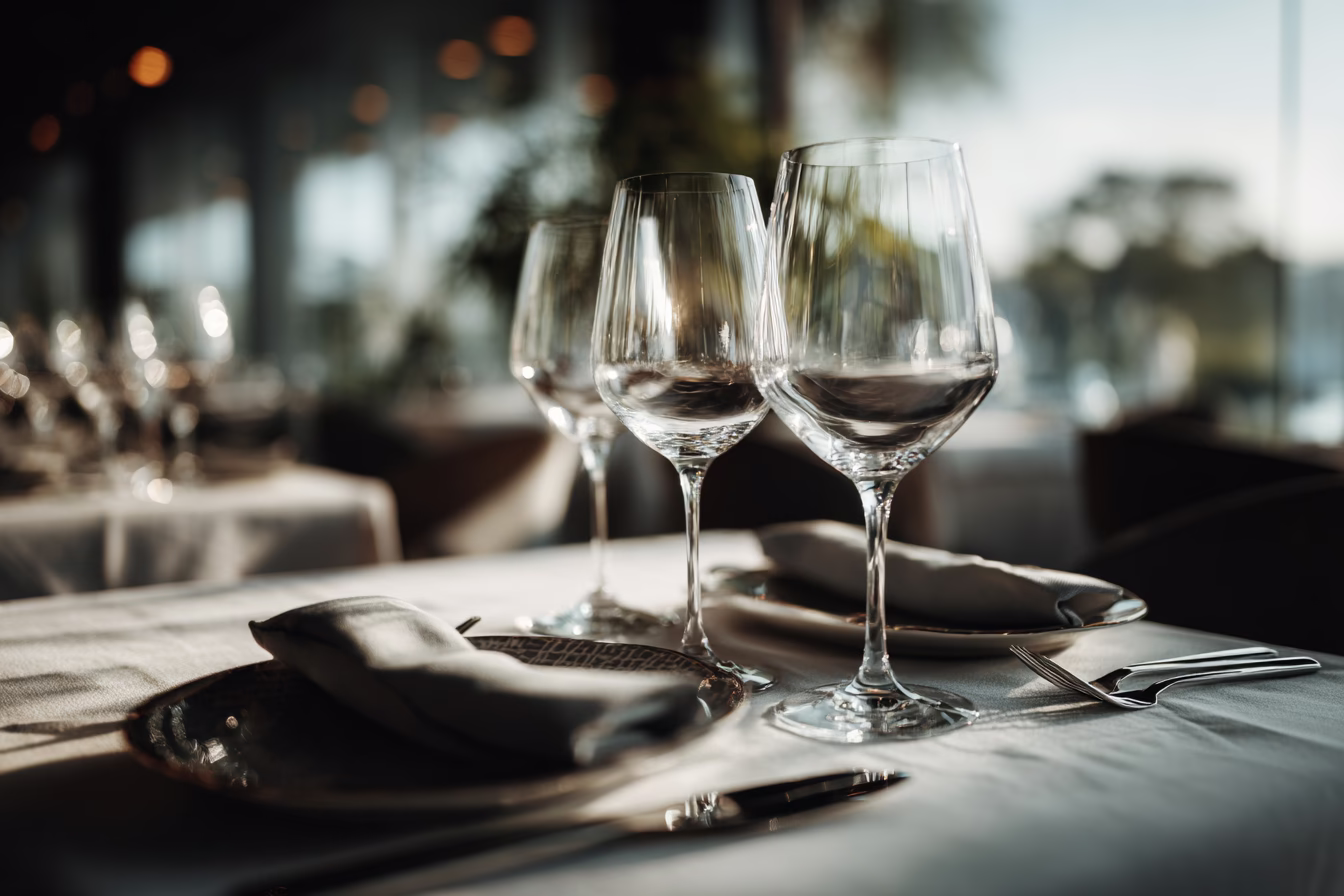 This image showcases an elegant restaurant setting featuring three glassware pieces in the foreground, reflecting the soft light streaming through the windows. The blurred background suggests a cozy atmosphere, with a table beautifully set with white linens and subtle details of plates and cutlery.