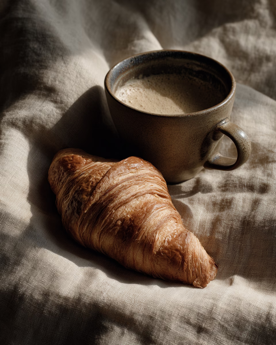 This image features a golden croissant alongside a cup of coffee, set against a light, crumpled fabric background. The soft light highlights the textures of the croissant and the surface of the coffee...