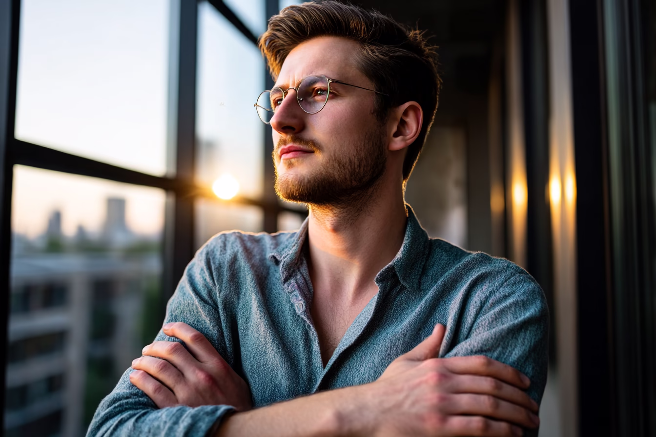 A contemplative man wearing glasses gazes at the horizon through a window during sunset, with golden light reflecting on his face, evoking tranquility and introspection. Perfect for those seeking a peaceful moment in an urban setting.