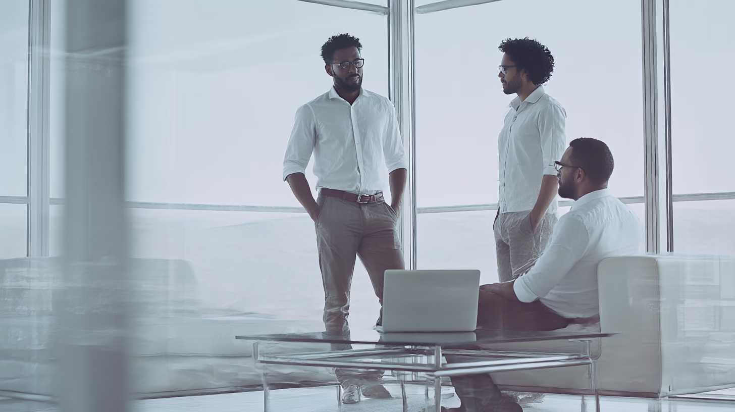 Three men in a modern office featuring glass windows, soft lighting, and a light gray and blue color palette, showcasing a minimalist and professional corporate environment. Perfect for businesses looking to convey a sleek and contemporary image.