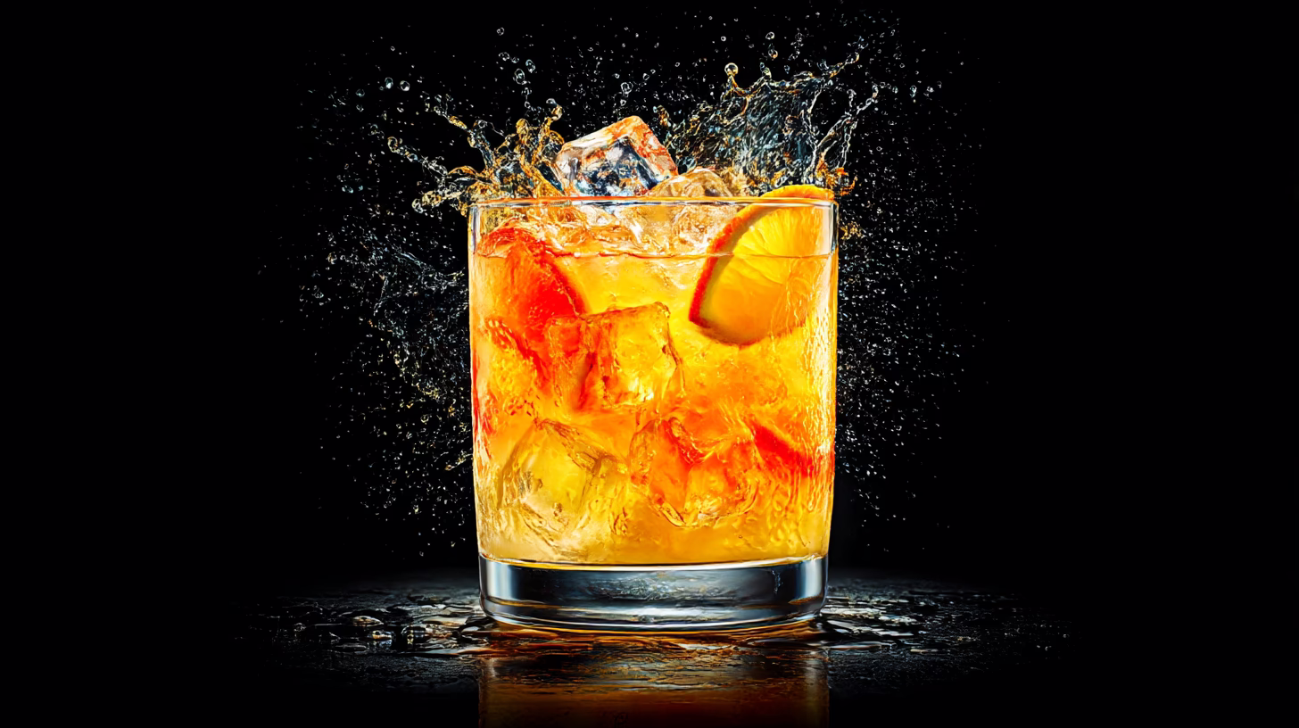 This image showcases a glass of golden drink adorned with ice cubes and orange slices, set against a striking black background. The vibrant light reflects off the drink, while the partially melted ice creates splashes around the glass, making it an enticing visual for beverage enthusiasts.