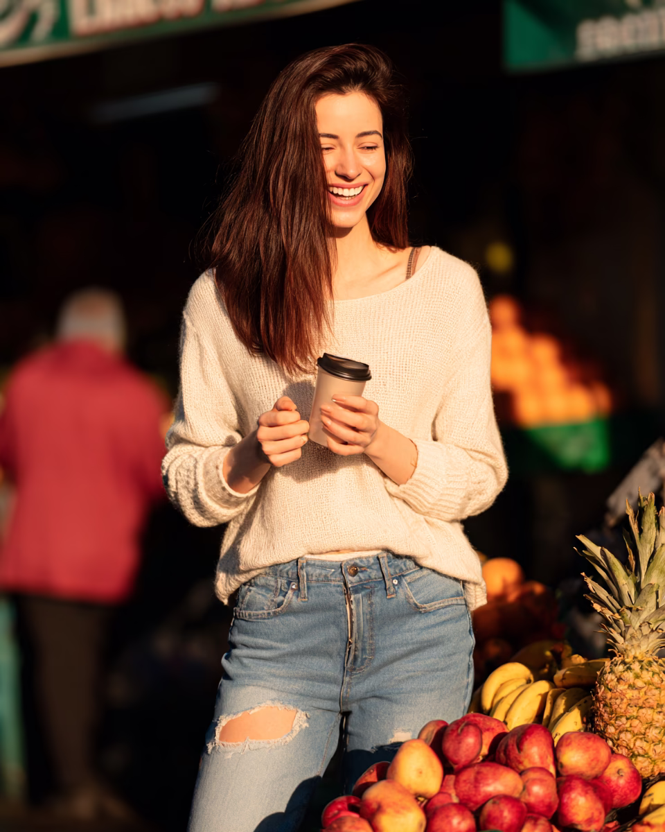 A smiling woman at an outdoor market holding a cup of coffee, dressed in ripped jeans and a white sweater, surrounded by fresh fruits under the warm golden sunlight, radiating joy and relaxation. Perf...