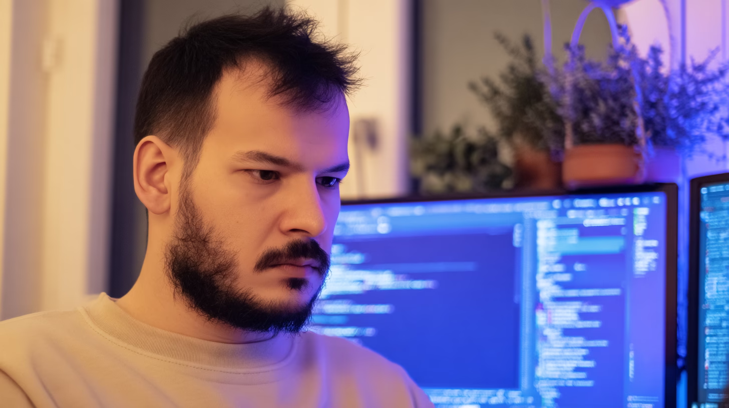 A focused man working in a dimly lit environment with dual monitors displaying code. The soft blue lighting and plants in the background create a calming atmosphere, perfect for night-time productivit...