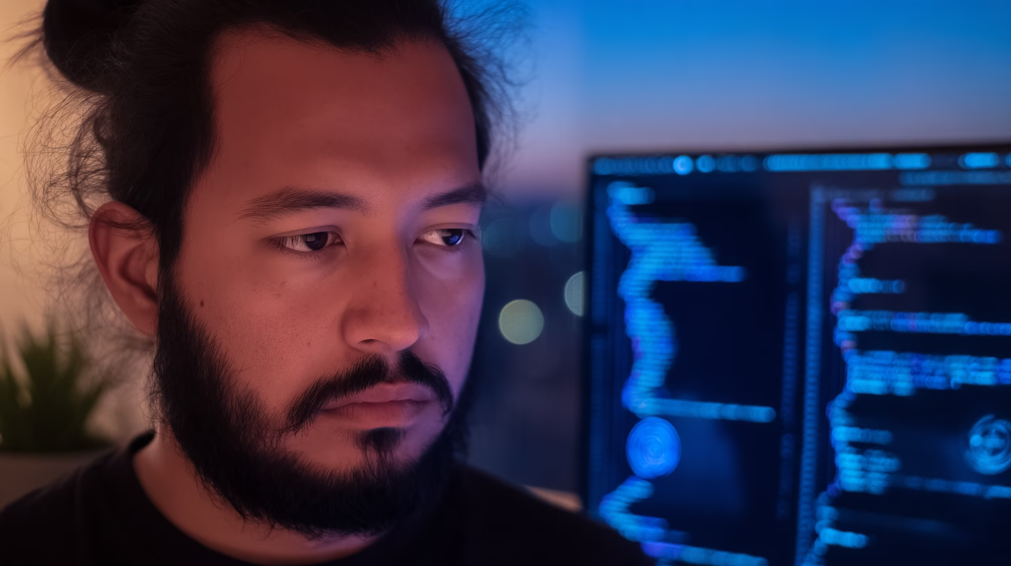 A focused programmer is intently observing the screen filled with code in a nighttime setting, illuminated by soft blue light, creating an atmosphere of concentration and technological creativity.