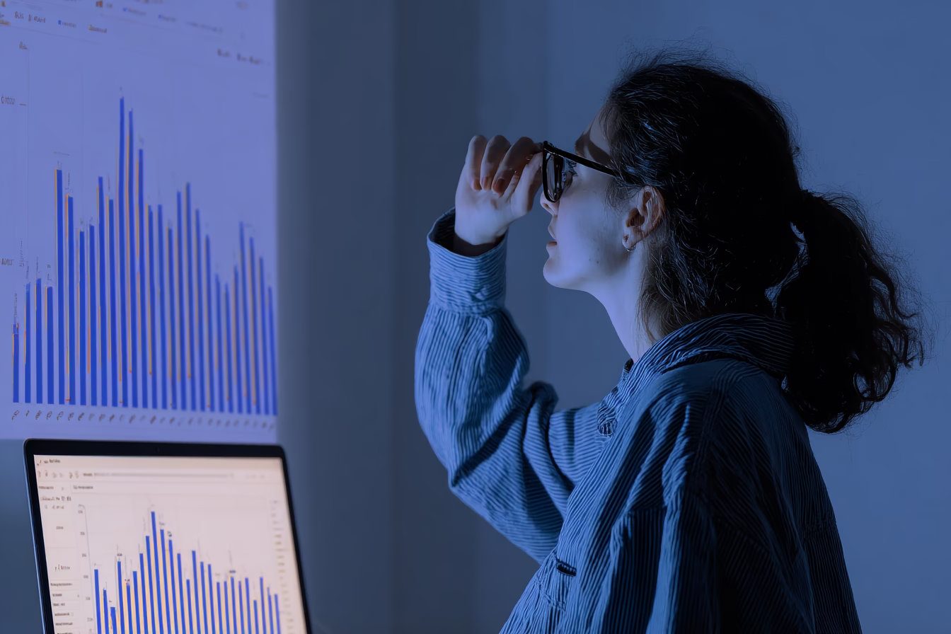 A person is analyzing data graphs on a computer screen, showcasing a modern corporate environment with a blue lighting ambiance, emphasizing data analysis and technology. Perfect for illustrating focused work in finance or statistics.