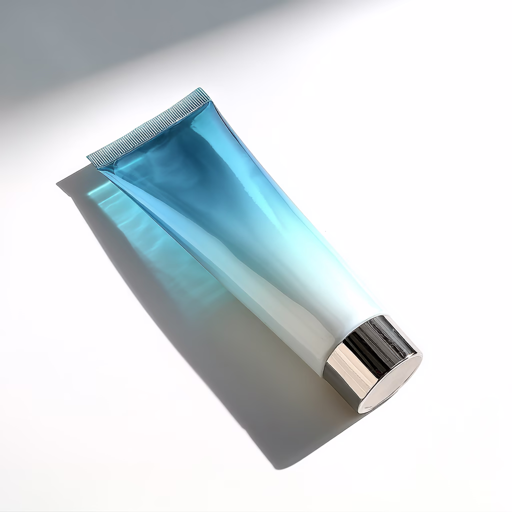 Discover the elegance and simplicity of this gradient blue cream tube set against a minimalist white background. The soft lighting creates delicate shadows, evoking a sense of freshness and purity, perfect for your cosmetic product line.