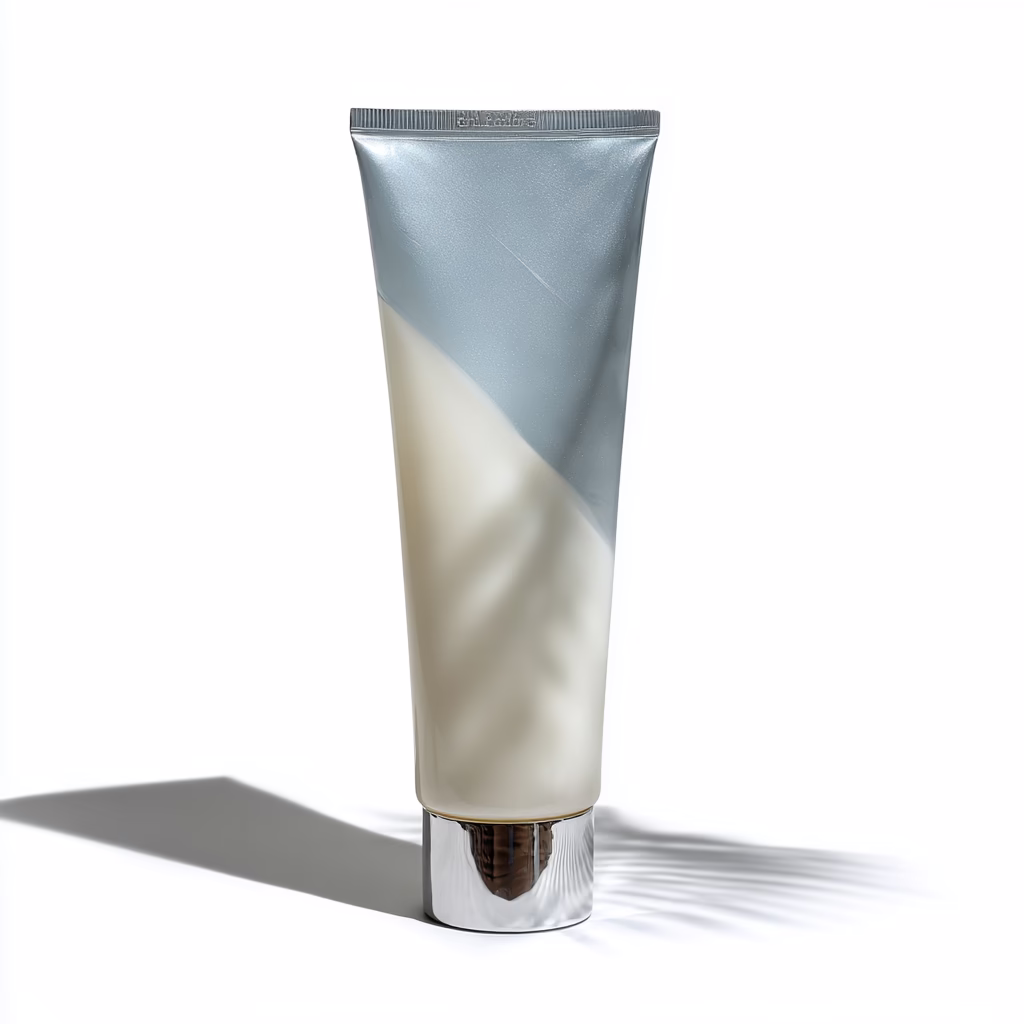 Discover this elegant cream tube set against a clean white background. Its minimalist design in silver and beige tones is enhanced by soft lighting that highlights the metallic shine of the cap, creating a delicate shadow that adds a sophisticated touch to the composition. Perfect for showcasing in