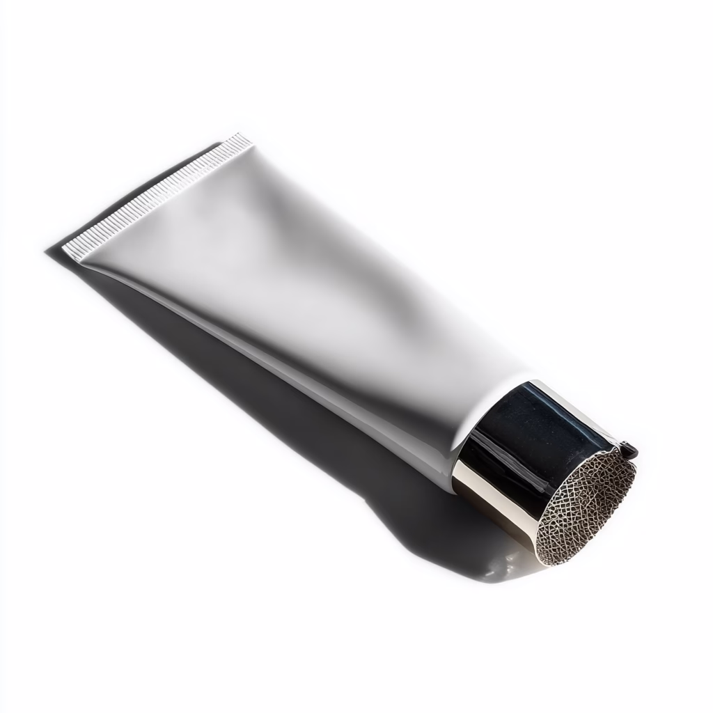 This image is classified with the tags: cream tube, silver tube, cosmetic packaging, minimalist design, white background.