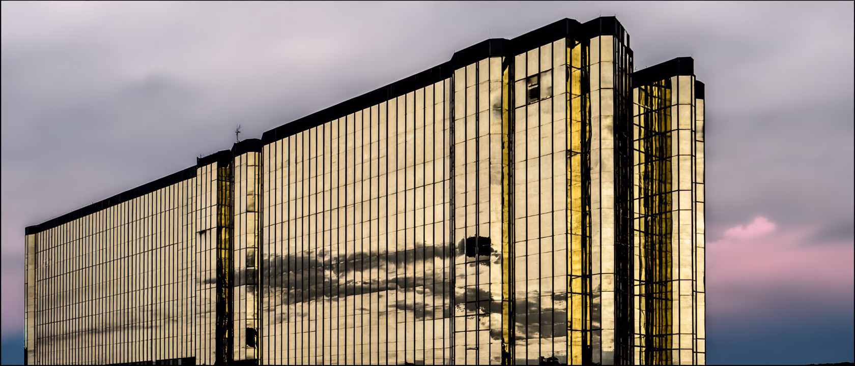 This modern building features a stunning golden mirrored facade that reflects the cloudy sky, standing out against a backdrop of soft colors at sunset. The straight and symmetrical lines of the archit...