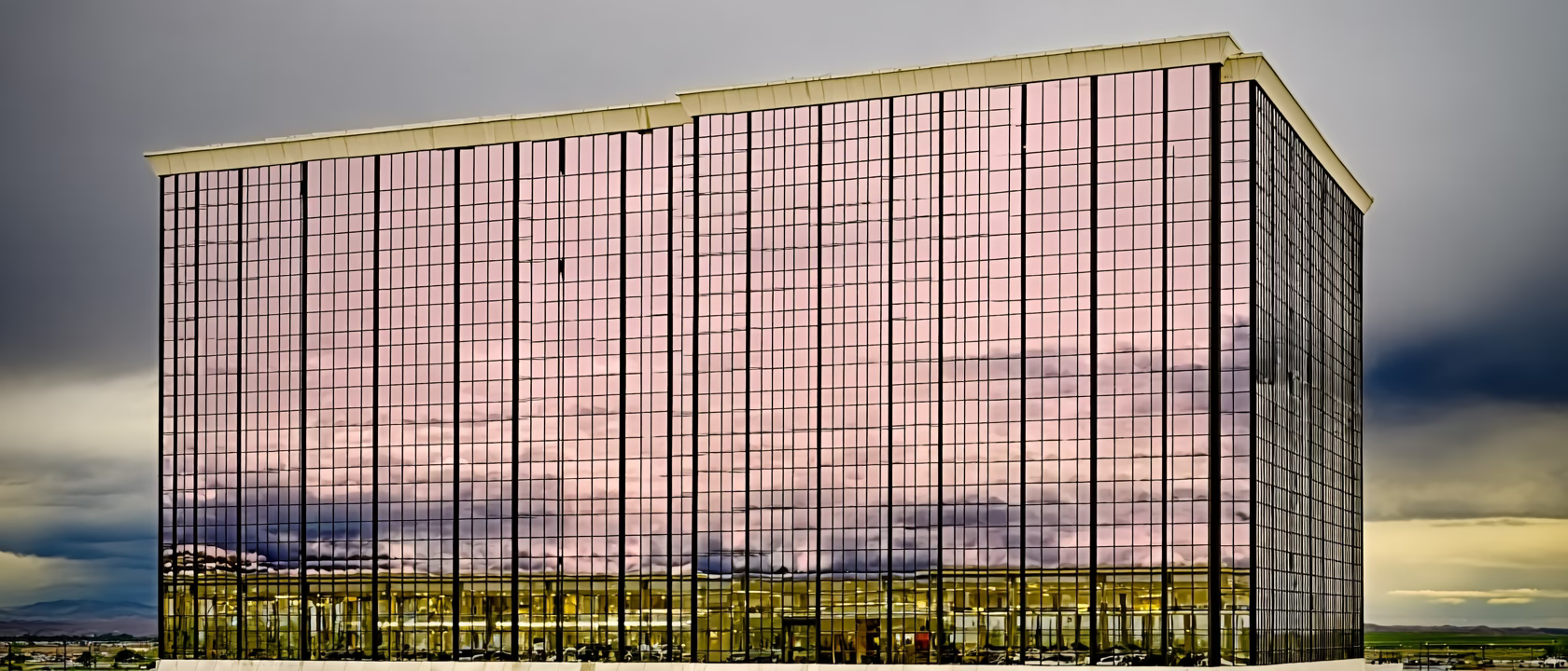 This modern glass building features a striking facade that mirrors the cloudy sky, blending shades of pink and gray. Its imposing square structure showcases straight, symmetrical lines, standing out against the dramatic sky. The soft, diffused lighting of sunset adds a touch of serenity to the urban