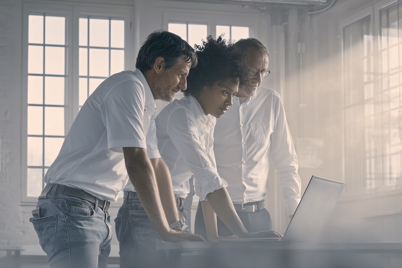 Three individuals are focused on a laptop screen in a modern office environment. The soft background lighting creates a collaborative and professional atmosphere, with large windows allowing natural l...