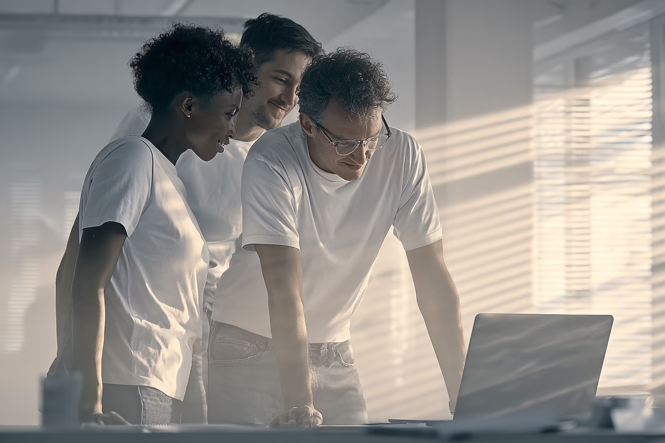 Three individuals stand around a laptop in a bright office space, illuminated by soft natural light. Dressed in white t-shirts, they showcase teamwork and focus, with the shadows of blinds creating an interesting pattern in the background. This image captures a modern and collaborative work setting,