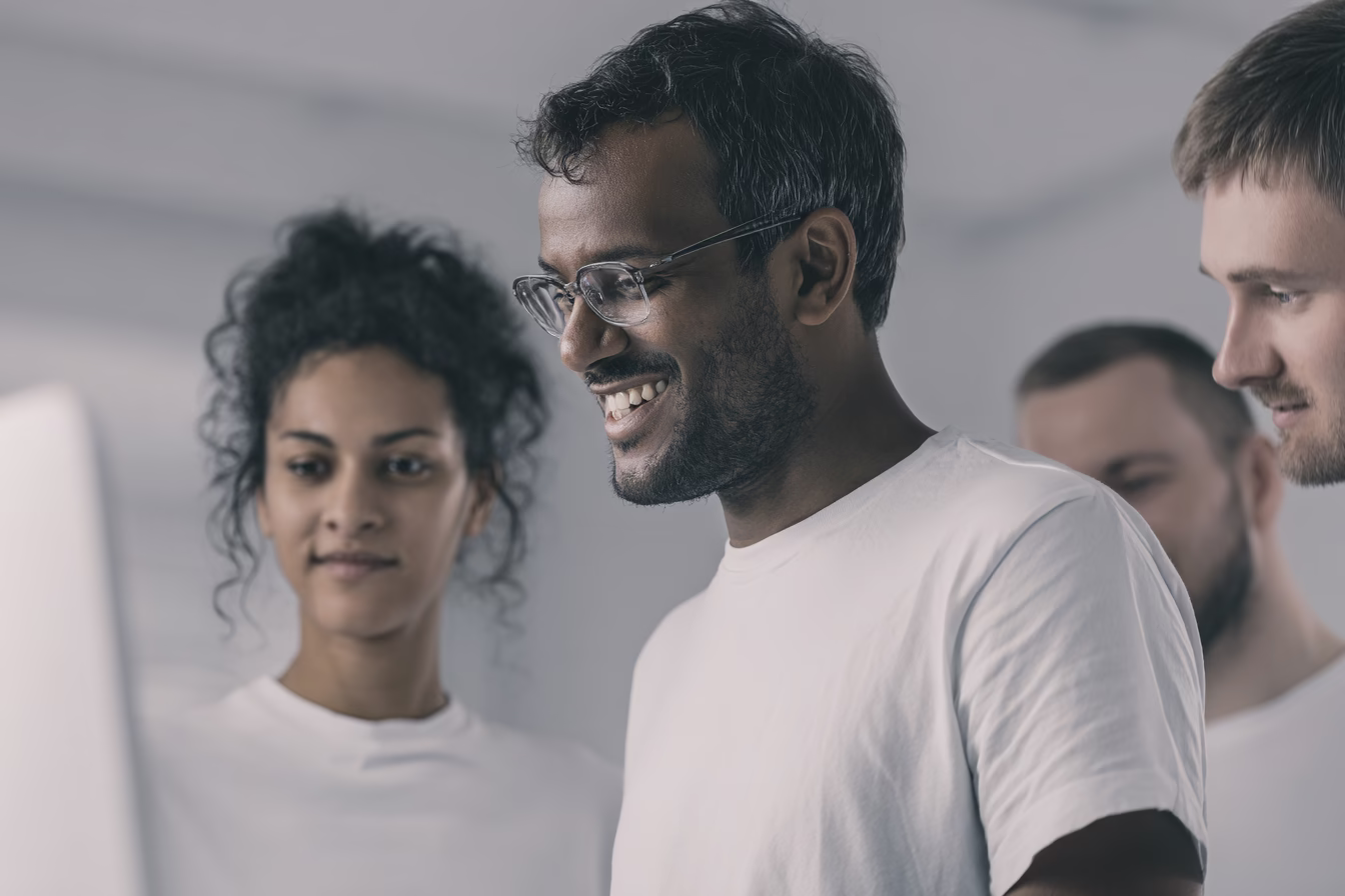 A group of four individuals engaged in a collaborative environment, focused on a laptop screen. The soft and even lighting creates a motivating atmosphere for teamwork. Dressed in white t-shirts that contrast with the light gray background, they smile and pay close attention, embodying a spirit of a