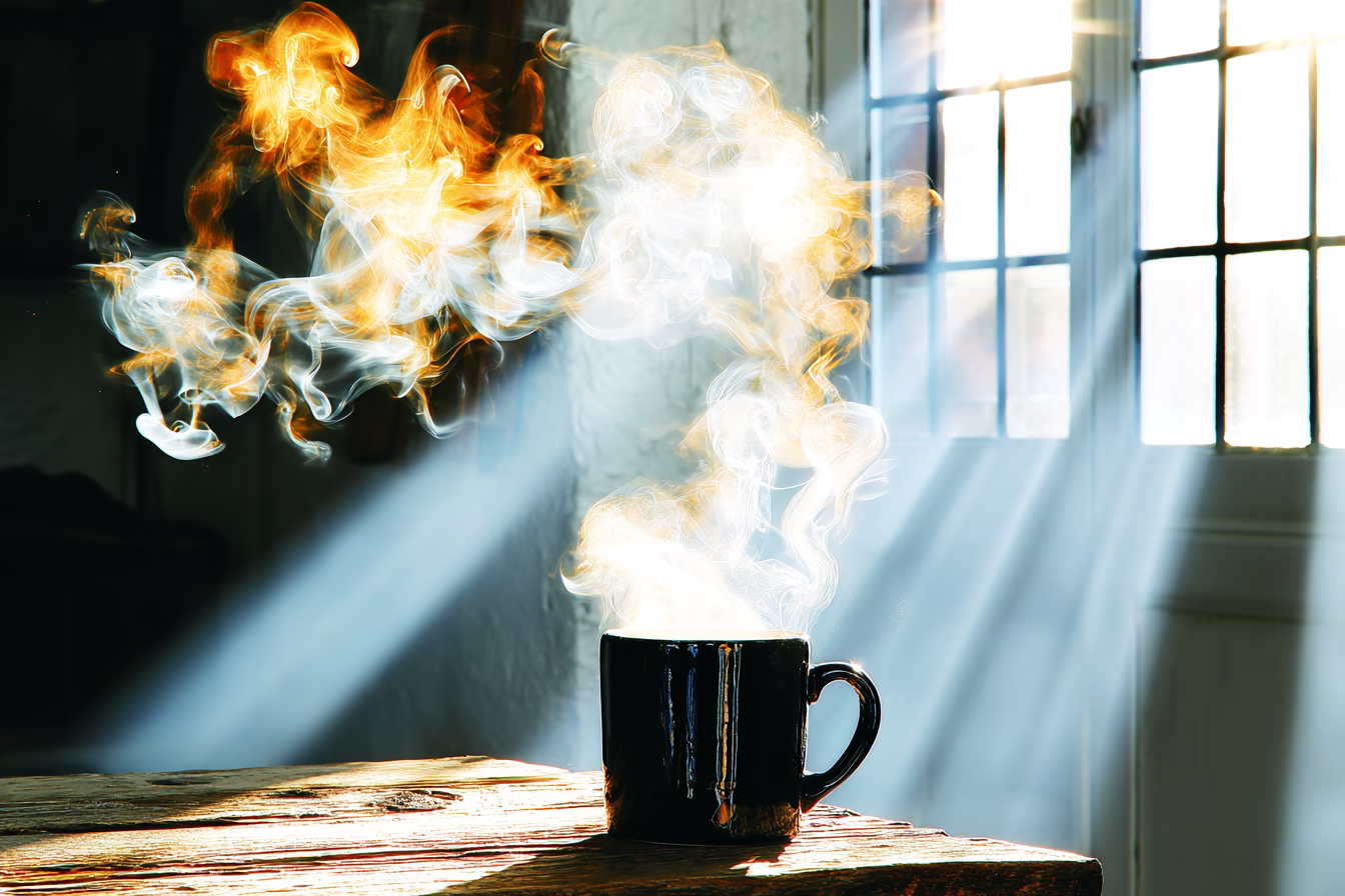 Experience the warmth of a black mug releasing orange smoke, beautifully illuminated by sunlight streaming through a window. This cozy scene on a rustic wooden table creates an inviting atmosphere, pe...