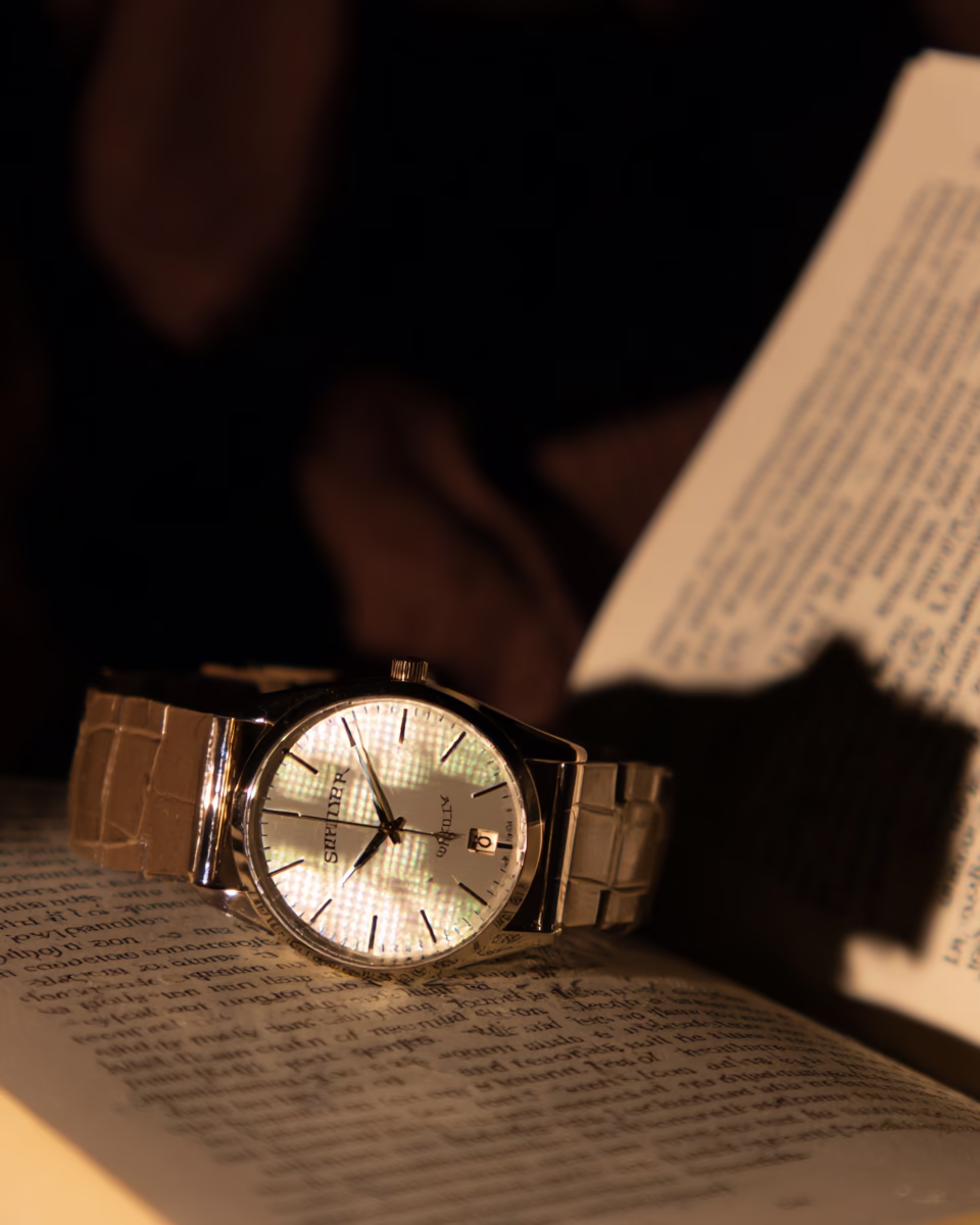 A silver watch rests on an open book, illuminated softly to highlight its elegant face. The blurred background creates a cozy and introspective atmosphere, while the interplay of light and shadow adds depth and dimension to this visually balanced composition.