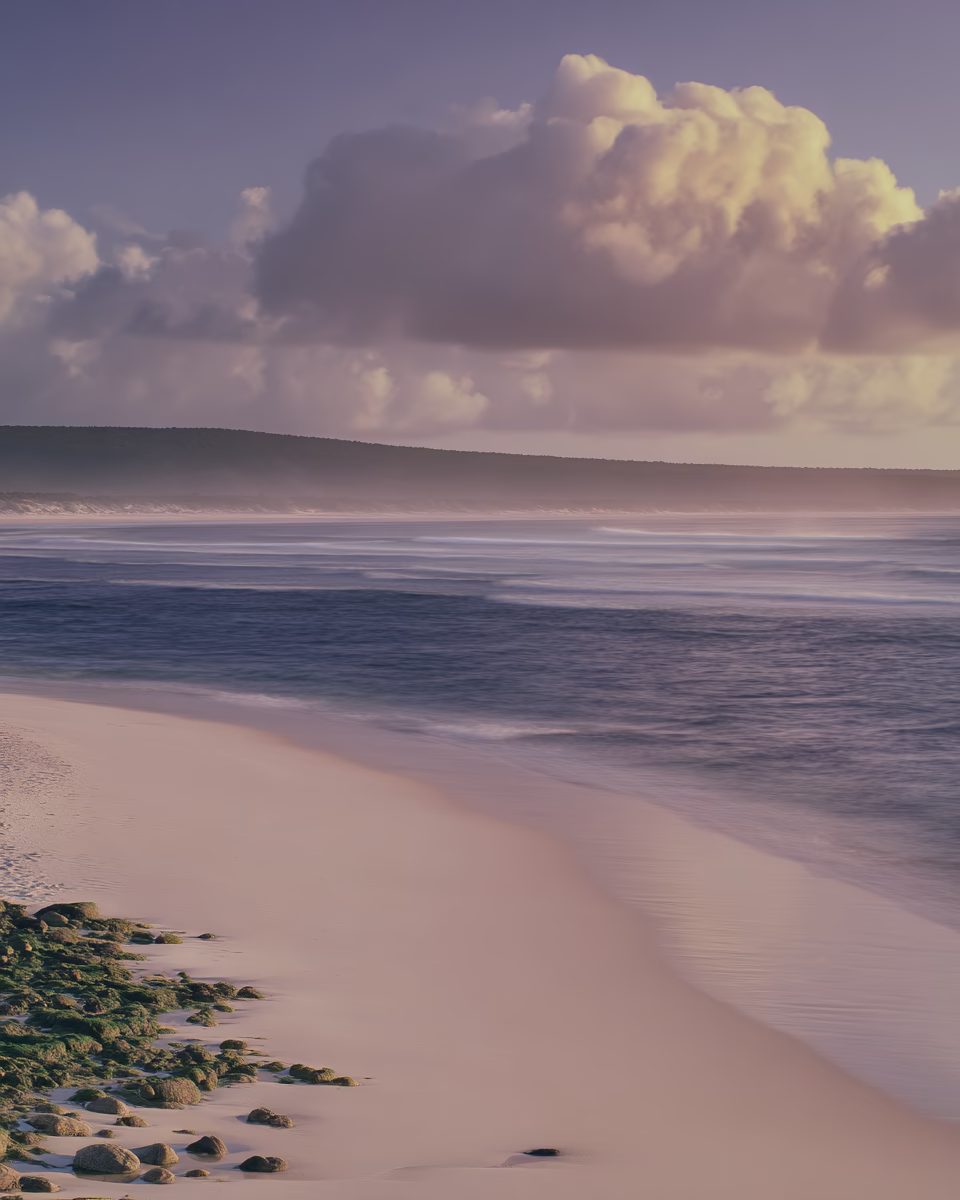 Experience a serene coastal landscape featuring soft white sand and a calm sea under a partially cloudy sky in shades of pink and lilac. The gentle light of sunset creates a tranquil and contemplative...