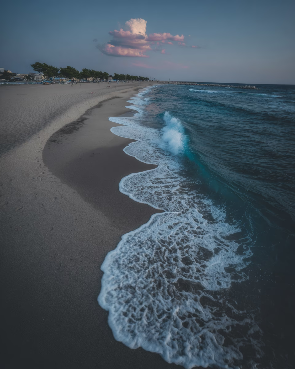 Experience the tranquility of a serene beach at sunset, where gentle waves caress the sandy shore. The deep blue sky adorned with soft pink clouds creates a poetic atmosphere. This aerial perspective highlights the curve of the coastline, complemented by distant trees and buildings, resulting in a a