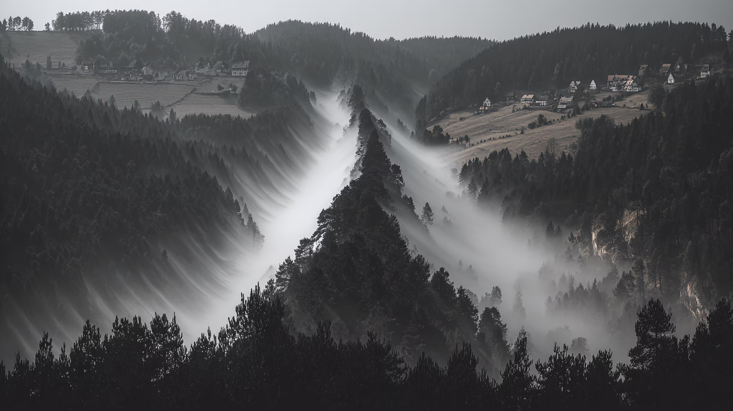 Explore this stunning mountain landscape where floating mist envelops trees in a serene valley. The distant houses on the hills evoke a sense of isolation and calm, creating an ethereal and mysterious...