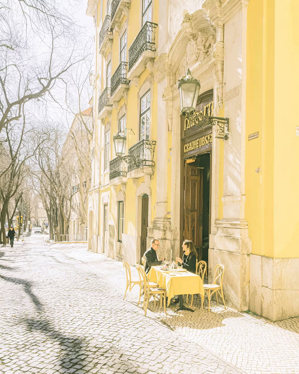 Experience the charm of a sunny street scene featuring a cobblestone sidewalk where two people enjoy coffee at an outdoor table. The yellow facade of a historic building with ornate balconies and large lanterns enhances the tranquil European atmosphere. Leafless trees cast intriguing shadows on the,