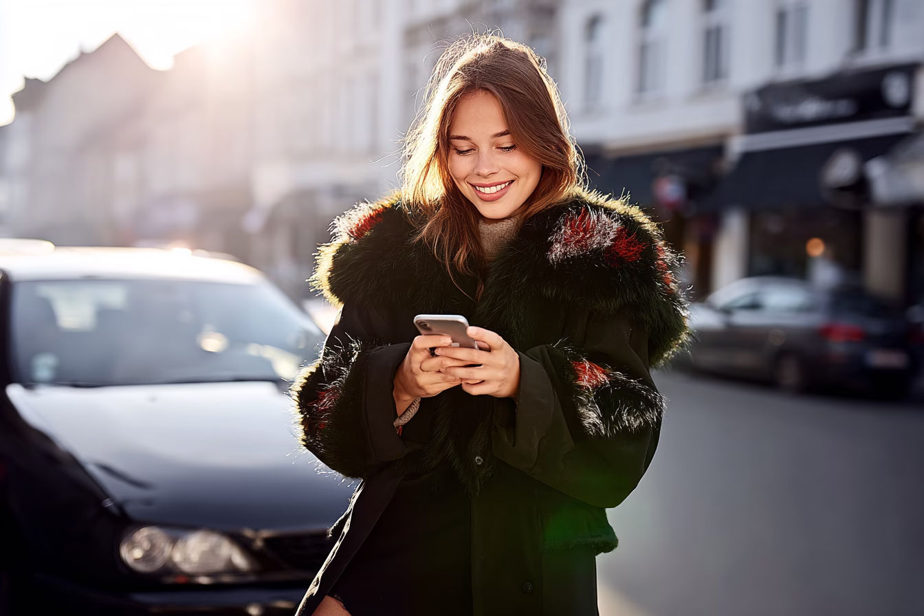 A smiling woman in a fur coat holds a smartphone while walking on a sunny urban street. The backlighting creates a soft, warm effect, highlighting her hair. The scene features parked cars and buildings in the background, composing a modern and casual atmosphere with a sharp focus on the central figu