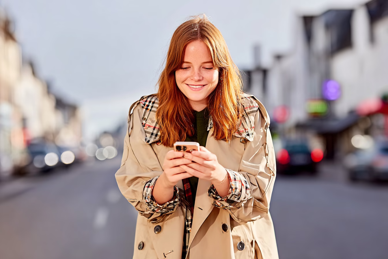 A smiling young woman with red hair reads something on her smartphone while walking down a busy street. The natural lighting highlights her beige coat, and the slightly blurred background creates a se...