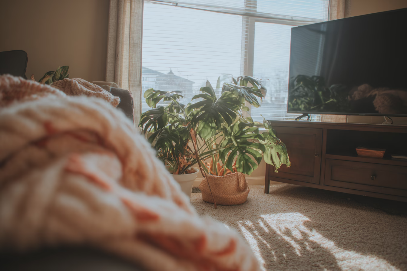 Discover a cozy living room featuring soft natural light, highlighted by a Monstera plant next to a modern television. This beautifully decorated space includes a warm throw blanket and a plush carpet, creating a perfect environment for relaxation and comfort.
