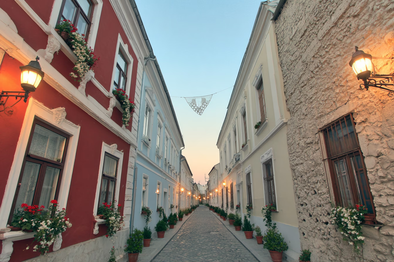 Explore a narrow cobblestone street lined with colorful historic buildings in shades of red and light blue. The scene is enhanced by windows adorned with hanging flowers and the soft glow of vintage street lamps, creating a captivating atmosphere at sunset that highlights the symmetry and depth of a