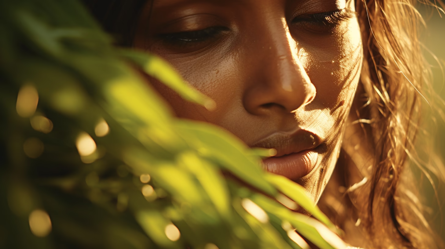 Discover the serene beauty of a woman's face partially hidden by lush green leaves. This close-up image captures the soft lighting and warm tones that enhance her skin texture, creating an intimate and tranquil atmosphere perfect for showcasing natural beauty. Ideal for beauty brands or wellness ads