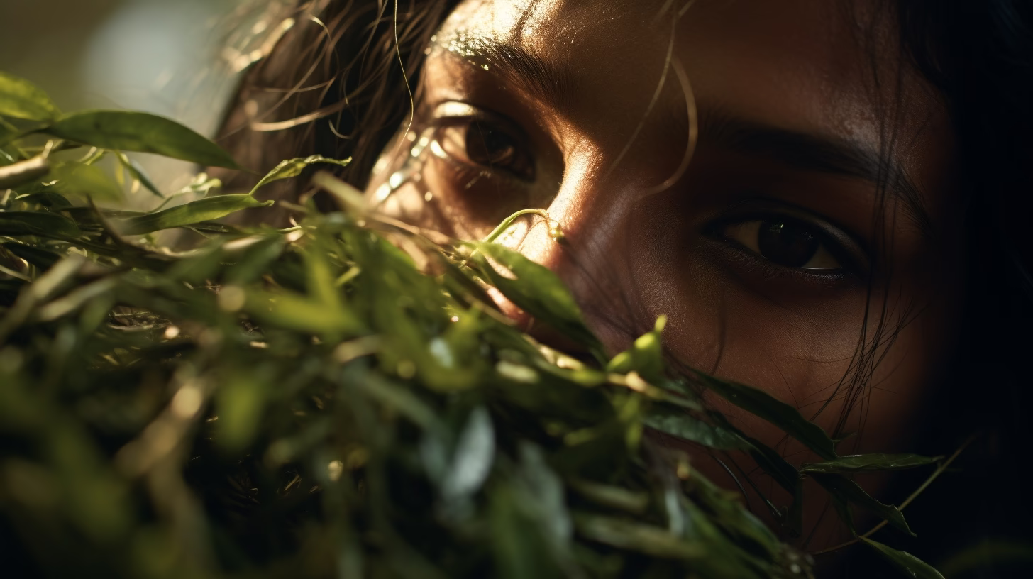 Discover the beauty of nature with this close-up portrait featuring a person partially hidden by lush green foliage. The expressive eyes and natural beauty are beautifully highlighted, while the interplay of light and shadows creates a serene atmosphere. Perfect for those looking to connect with the
