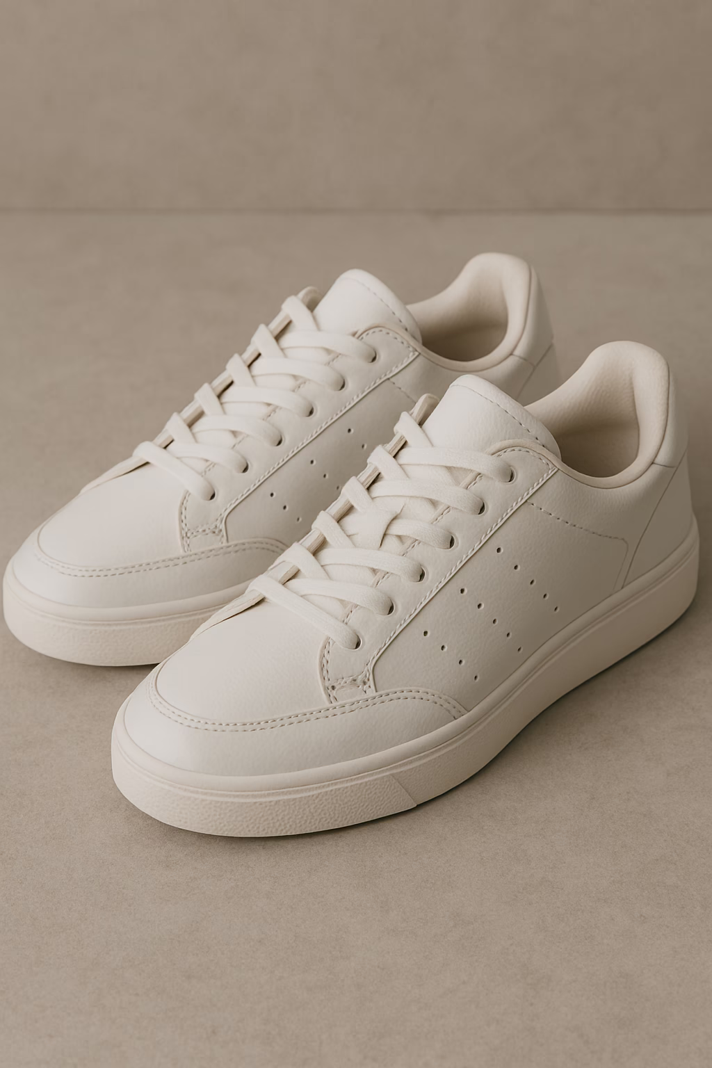 Discover these stylish white leather sneakers featuring a soft texture, set against a beige background. The rounded shapes and symmetry are highlighted under gentle lighting, creating a minimalist atm...