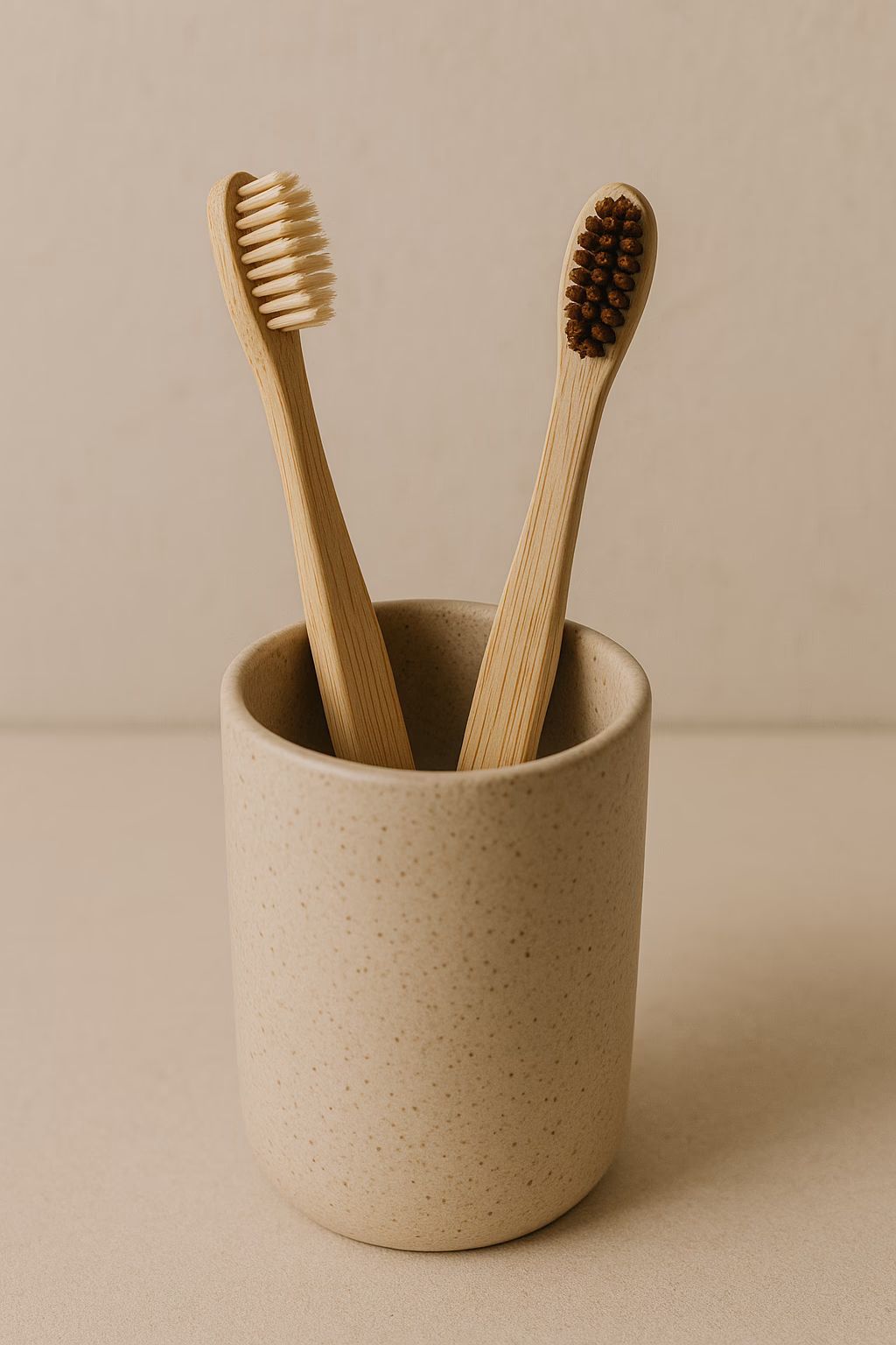 Discover these two bamboo toothbrushes elegantly displayed in a beige ceramic cup. The soft lighting highlights their natural bristles and texture, creating a minimalist composition with a neutral background. Perfect for those seeking simplicity and sustainability in their daily hygiene routine.