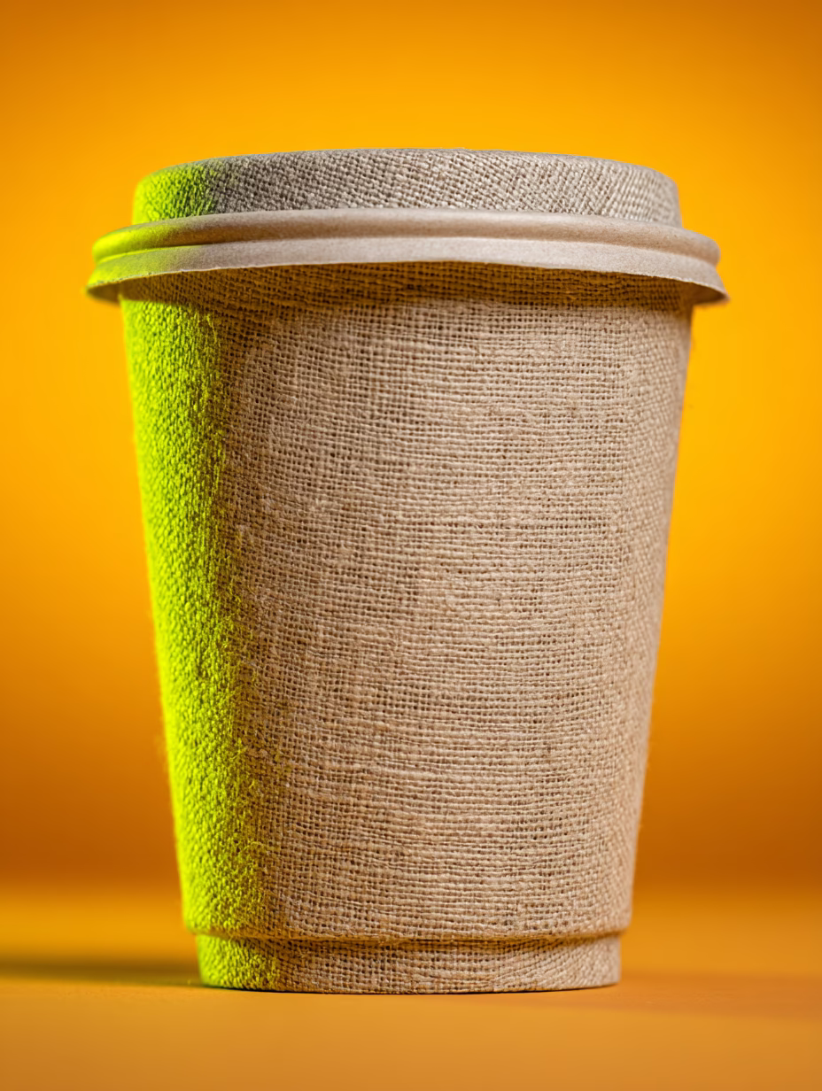 Discover a modern coffee cup featuring a unique jute texture set against a vivid orange backdrop, softly illuminated by green light. This intriguing contrast makes it a perfect choice for contemporary design projects or coffee-related themes.