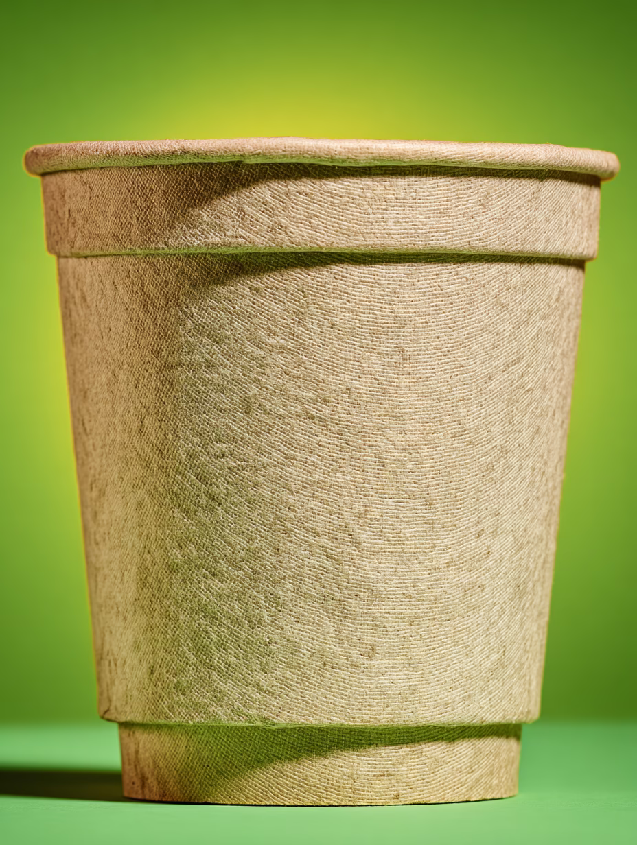 Close-up of a biodegradable paper cup on a bright green background, showcasing its fibrous texture and material details. The soft, even lighting creates a vibrant contrast with the background, and the centered minimalist composition ensures a sharp focus on the cup's design.