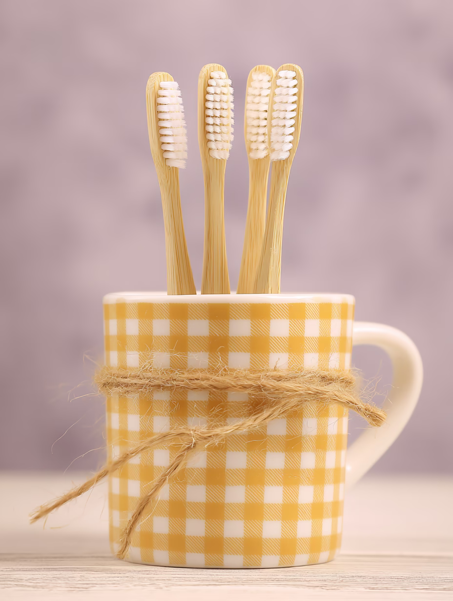 Eco-Friendly Bamboo Toothbrushes in Yellow and White Checkered Cup