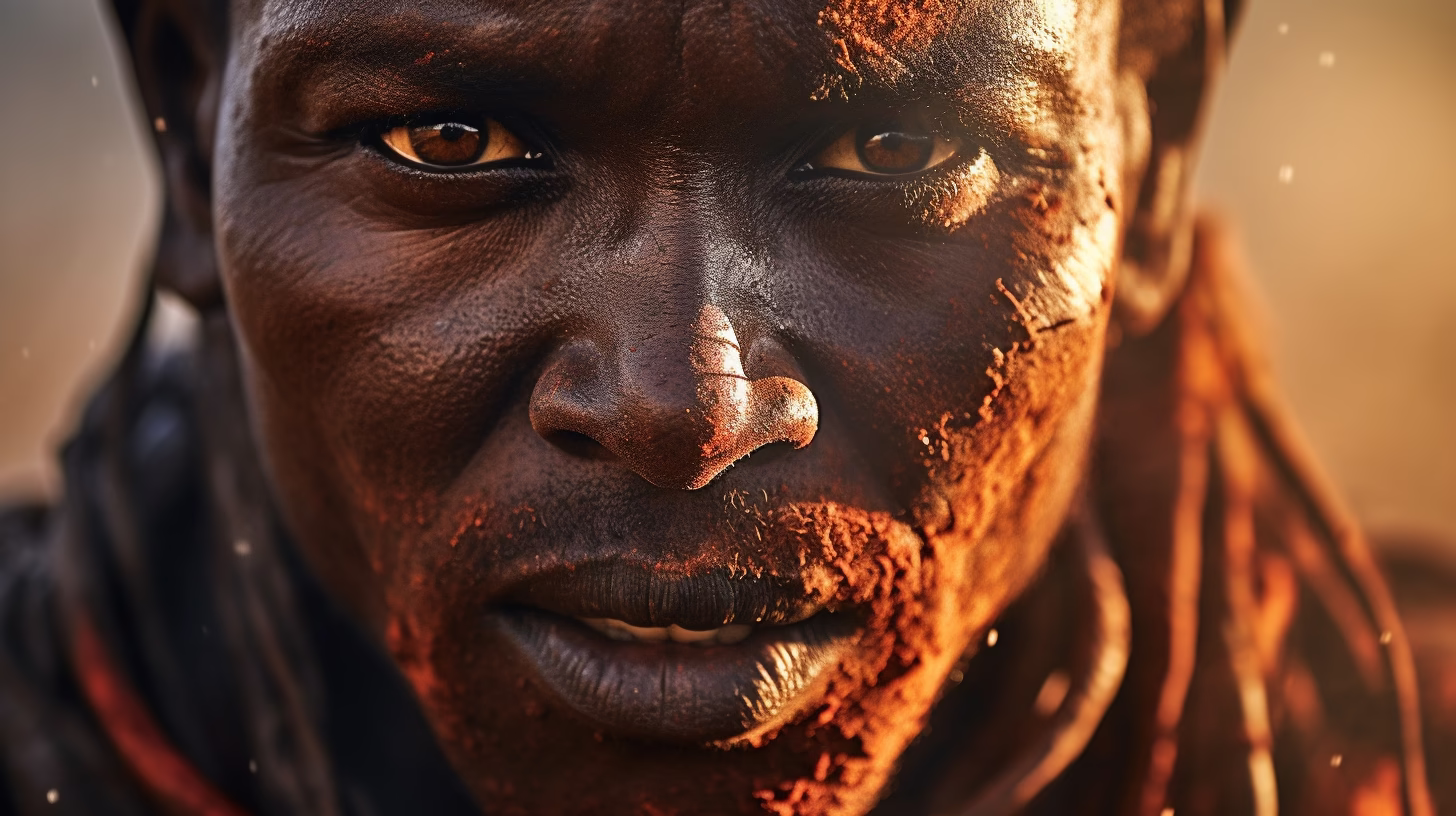 Discover this striking close-up portrait of a man with a textured face covered in red earth. His intense brown eyes and serious expression stand out against a softly blurred natural background, making...