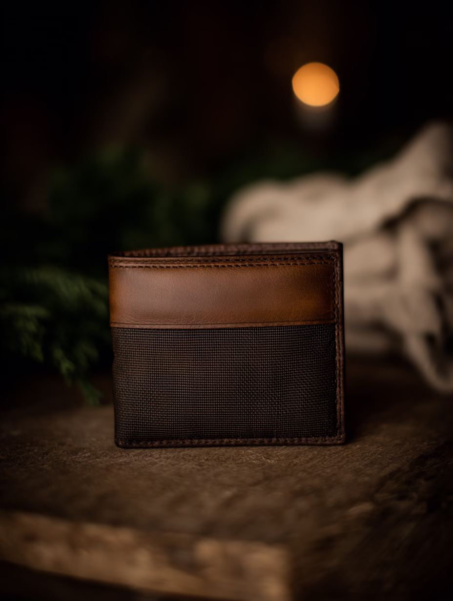 Discover this elegant brown leather wallet featuring dark fabric accents, beautifully displayed on a wooden table. The soft lighting enhances the leather's texture, creating a cozy and sophisticated a...