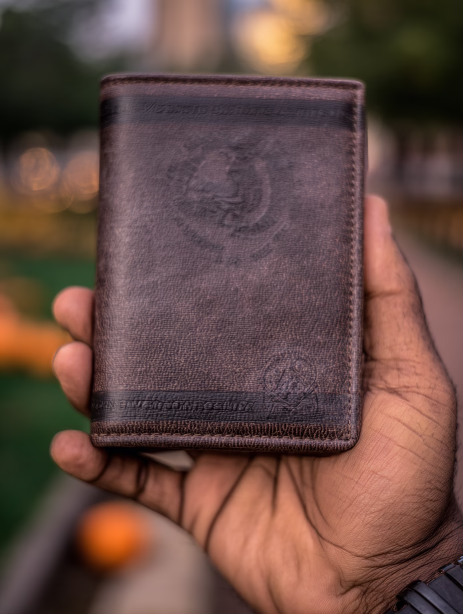 Discover this elegant brown leather wallet featuring an embossed design. The sharp focus on the material's texture, combined with a softly blurred background and natural lighting, highlights the produ...