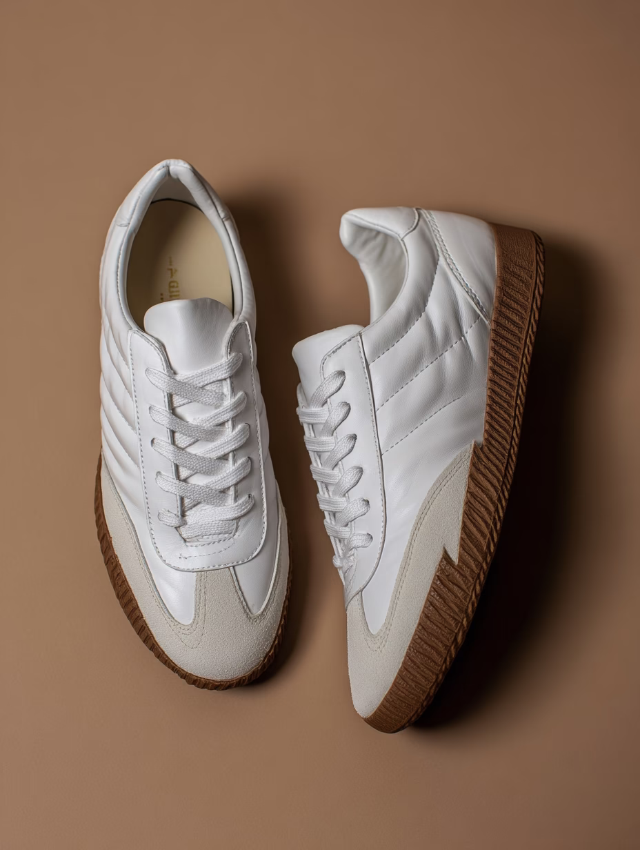 Discover these stylish white sports sneakers featuring a modern design with textured leather accents and brown rubber soles. The minimalist and symmetrical composition is beautifully highlighted by soft lighting, showcasing the subtle sheen of the material. Captured from an overhead angle, this shot