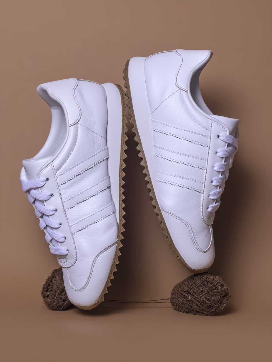 Discover these elegant white leather sneakers showcased in a vertical position against a soft brown background. The gentle lighting enhances the textures, while the minimalist composition highlights t...