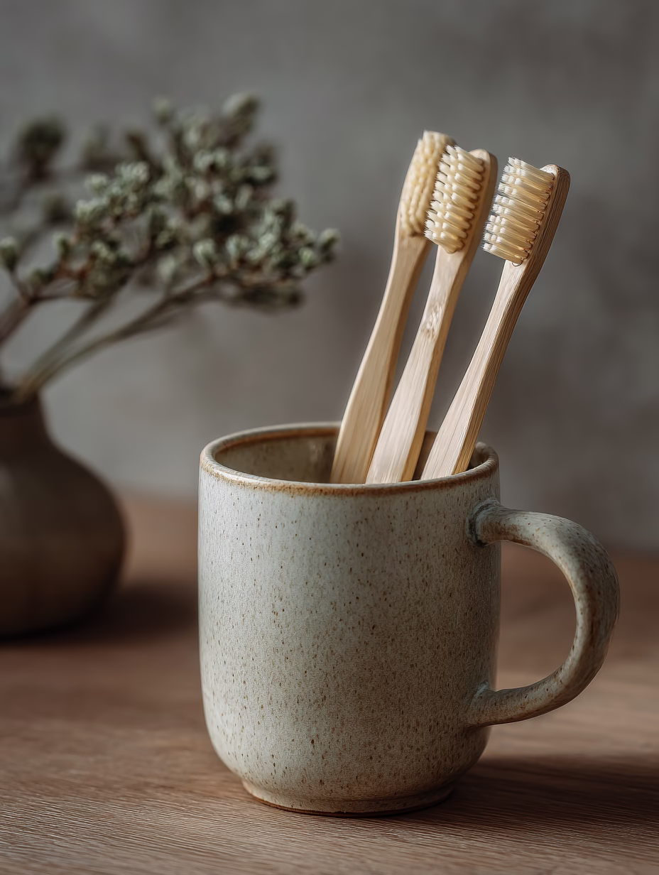 This image is classified with the tags: bamboo toothbrush, ceramic cup, minimalist design, sustainable living, eco-friendly.
