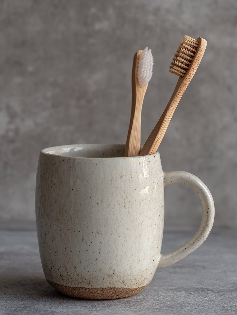Bamboo Toothbrushes in a Beige Ceramic Mug