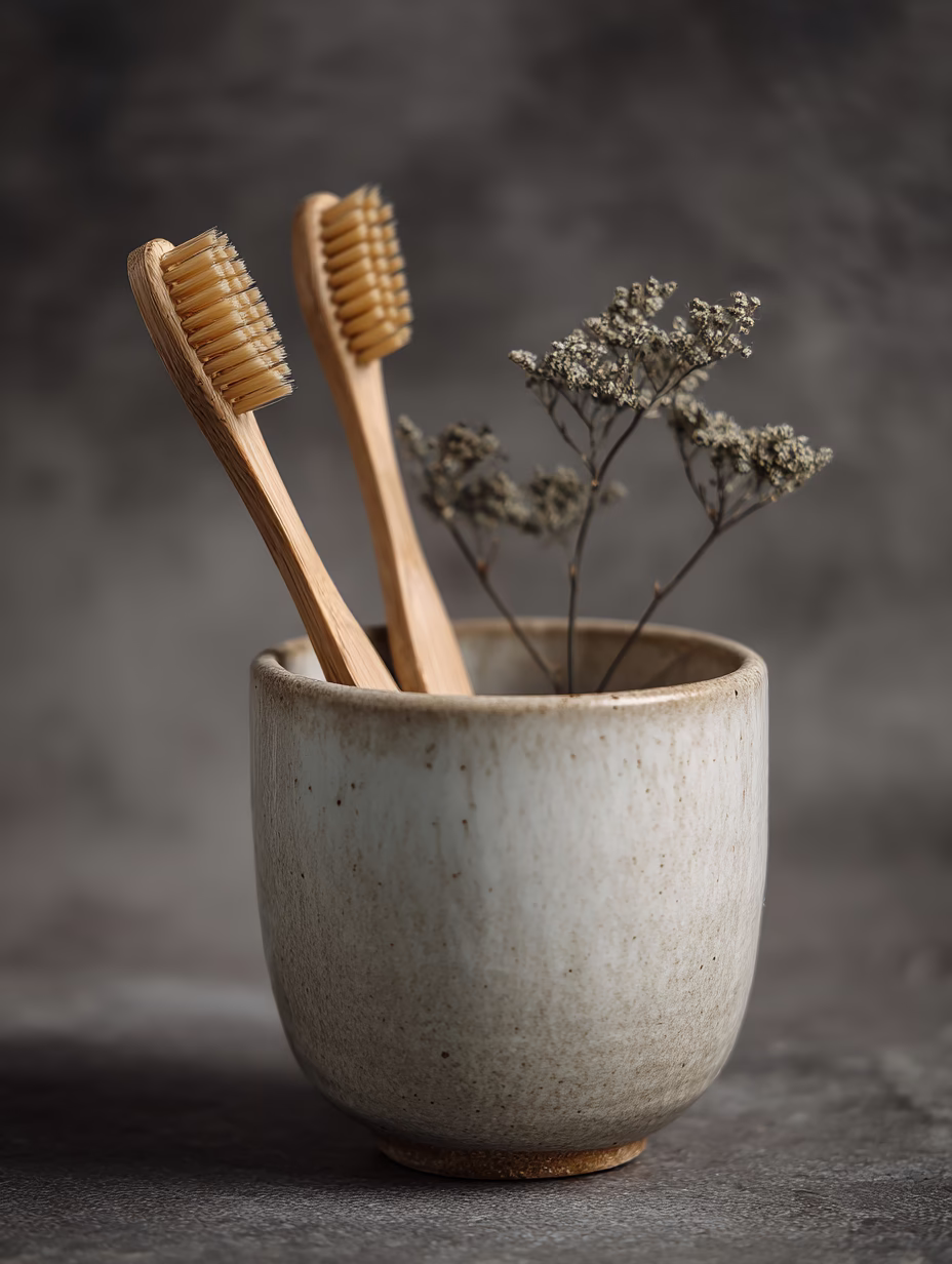Bamboo Toothbrushes in Ceramic Cup