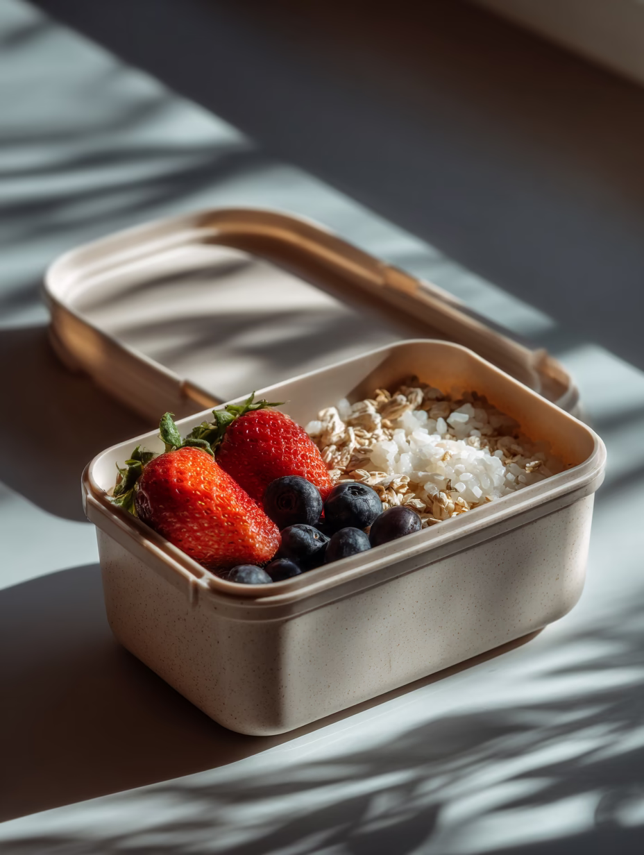 This neutral-colored lunchbox features fresh strawberries, blueberries, rice, and cereals, beautifully illuminated by soft natural light. The minimalist composition highlights the vibrant colors of th...