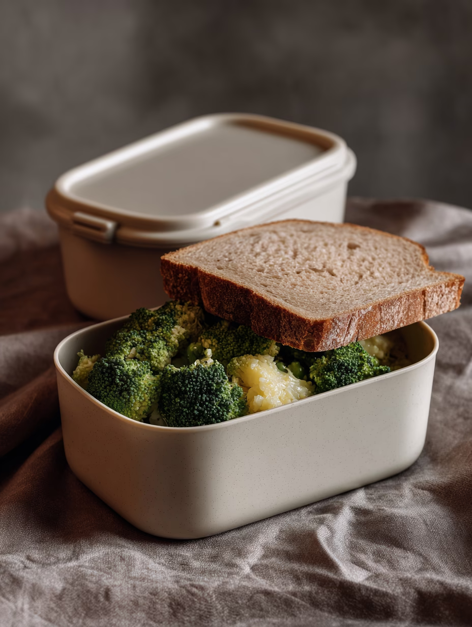 Discover this beige plastic container featuring an open sandwich made with whole grain bread and cooked broccoli. The minimalist composition highlights the soft texture of the gray cloth against the rigid surface of the container, while the gentle light creates a warm and homey atmosphere. Perfectly