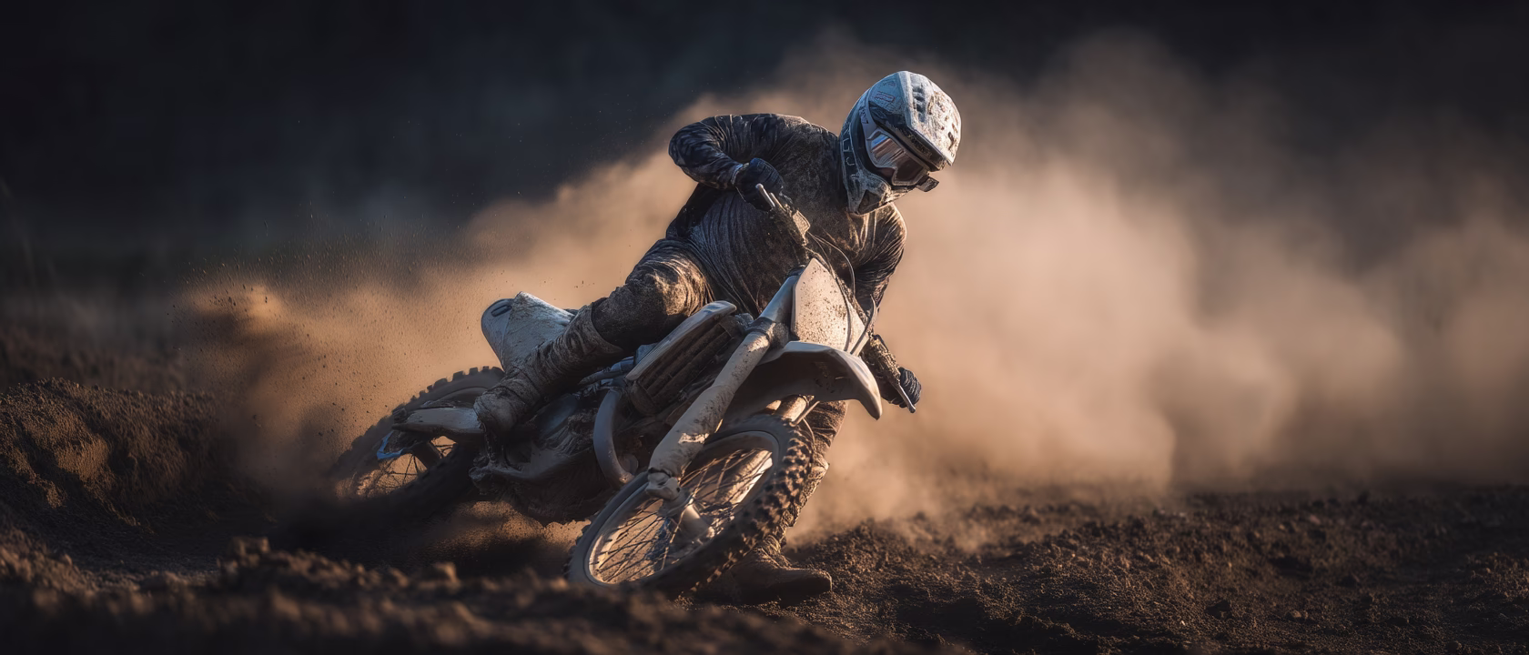Experience the thrill of motocross with this dynamic image of a rider navigating a dirt track at high speed. The off-road motorcycle kicks up dust as the rider expertly leans into a turn, fully equipped with protective gear including a helmet and motocross apparel. Perfect for showcasing the energy,
