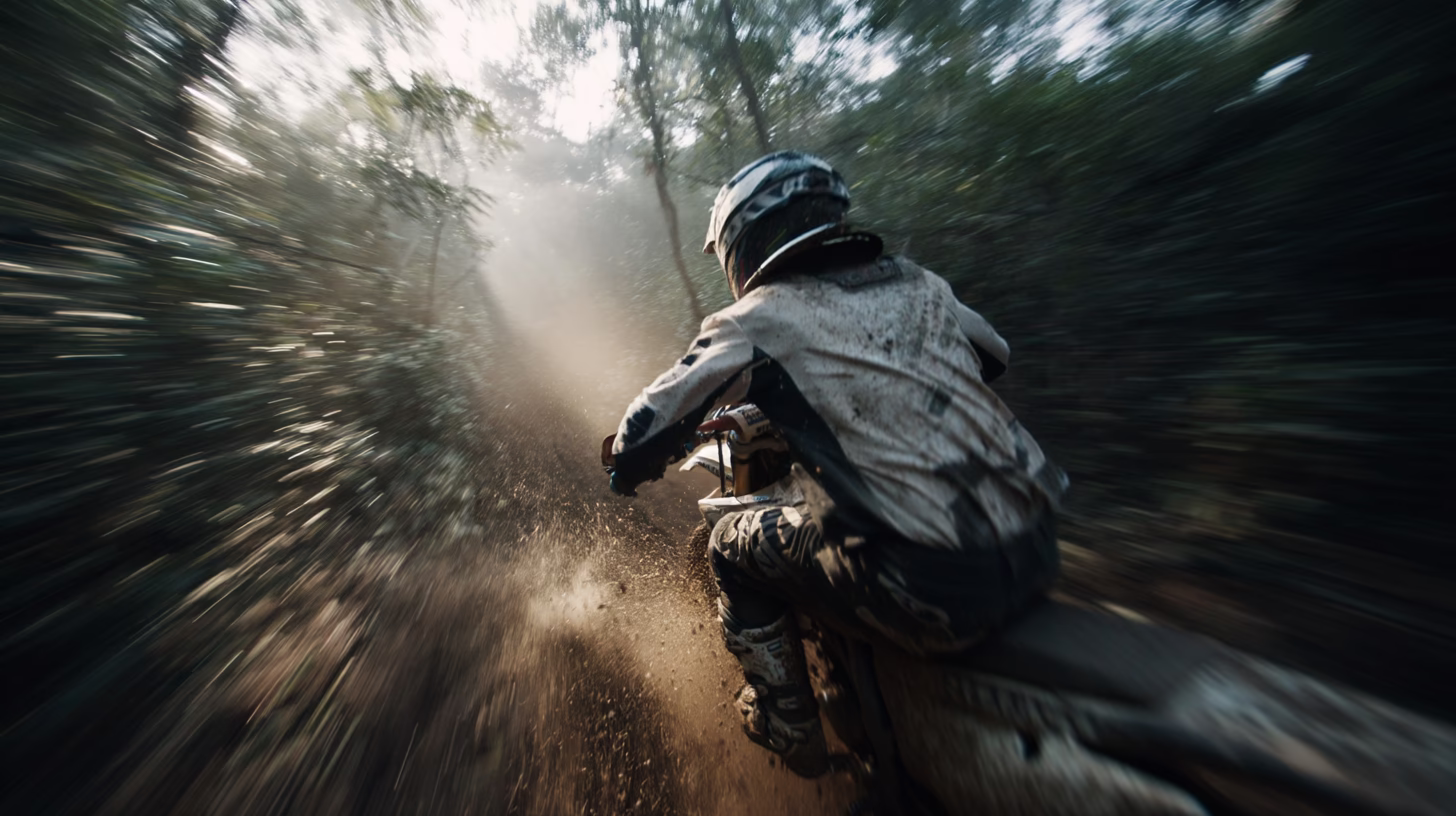 An off-road motorcycle rider speeds through a forest trail, kicking up dust as they accelerate. This image captures the thrill of movement and adventure in nature, perfect for showcasing outdoor sports and adrenaline-fueled activities.