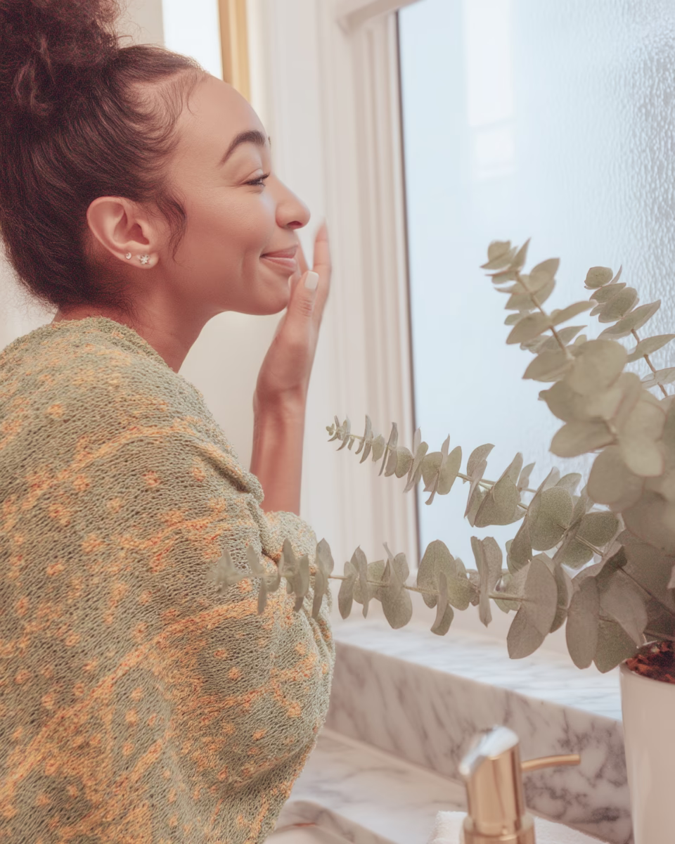 This image is classified with the tags: woman, facial cream, bathroom, self-care, eucalyptus.