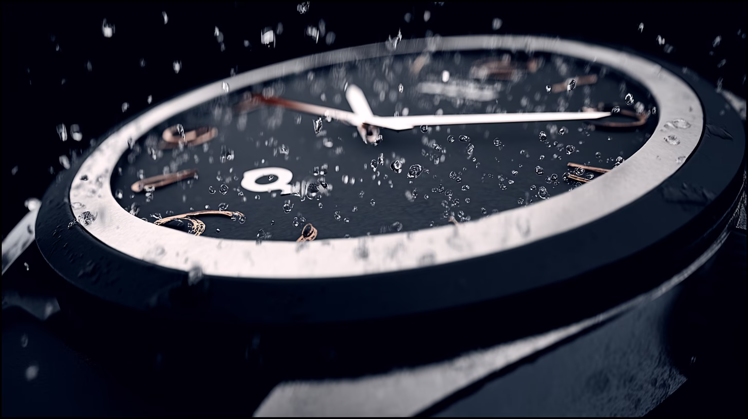 This high-resolution close-up image showcases a sophisticated wristwatch featuring a black dial and gold details. Water droplets suspended on the surface create a dynamic feel, while soft lighting enh...