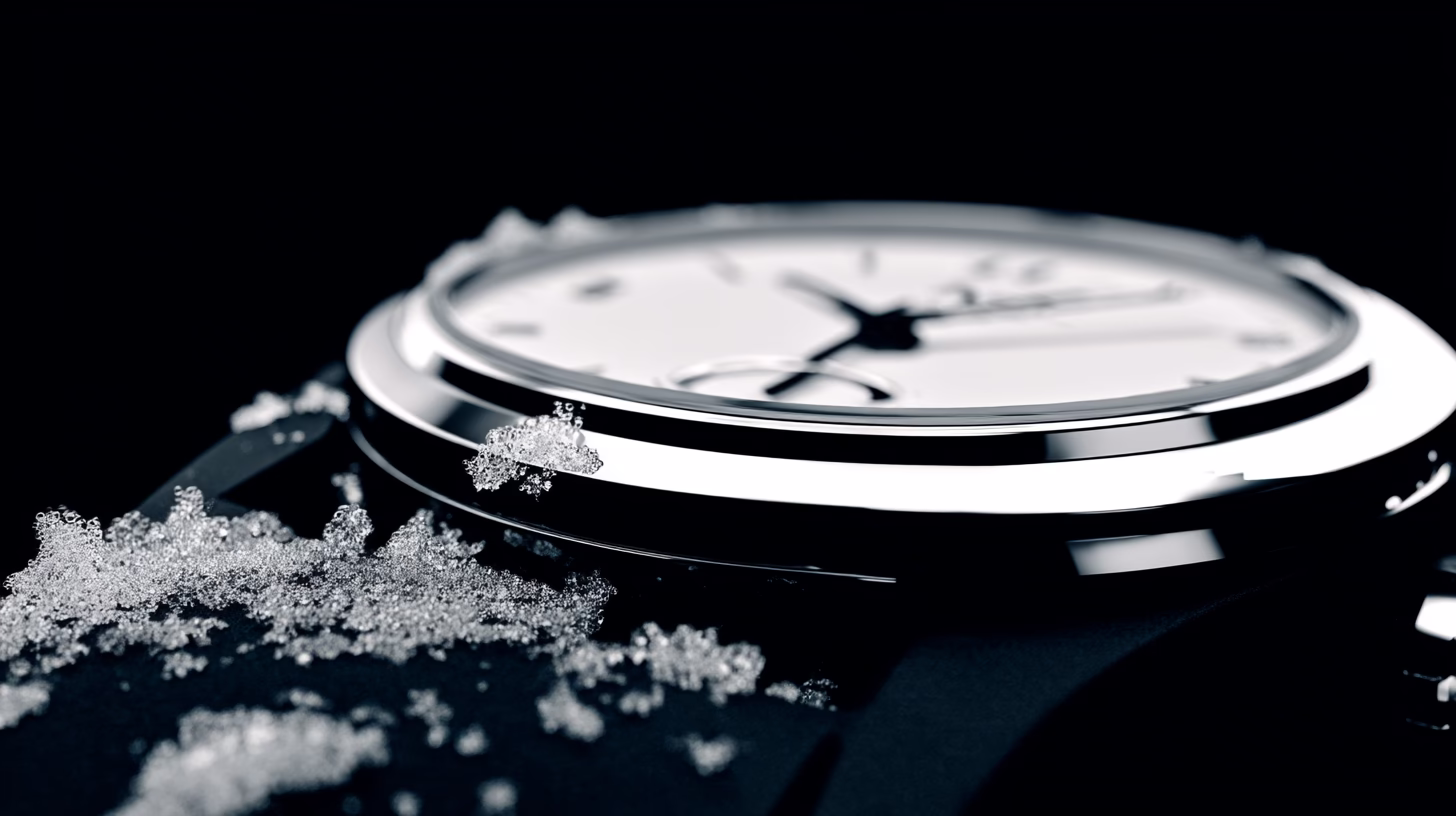 This close-up features a luxury silver watch adorned with snowy or icy details on its surface, set against a dark background. The soft lighting highlights the metallic shine and the watch face, creating a sophisticated and minimalist composition that appeals to discerning buyers.