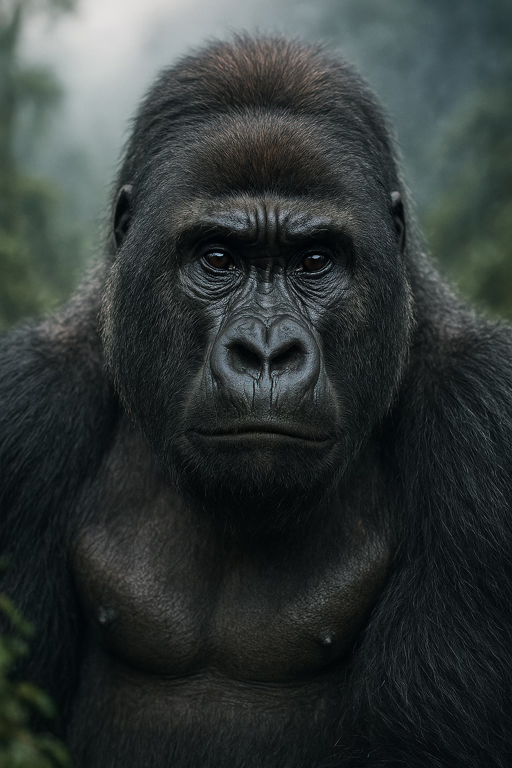This striking portrait of a gorilla in its natural jungle habitat captures an intense and powerful gaze. The image conveys a sense of strength and majesty, highlighting the lush forest environment and the detailed texture of the gorilla's skin under soft lighting. Perfect for wildlife enthusiasts or